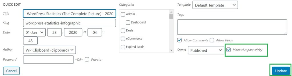 You can also get your post to stick by simply using the “Quick Edit” option as shown below. From you WordPress admin dashboard, go the post you want to edit and click on “Quick Edit“